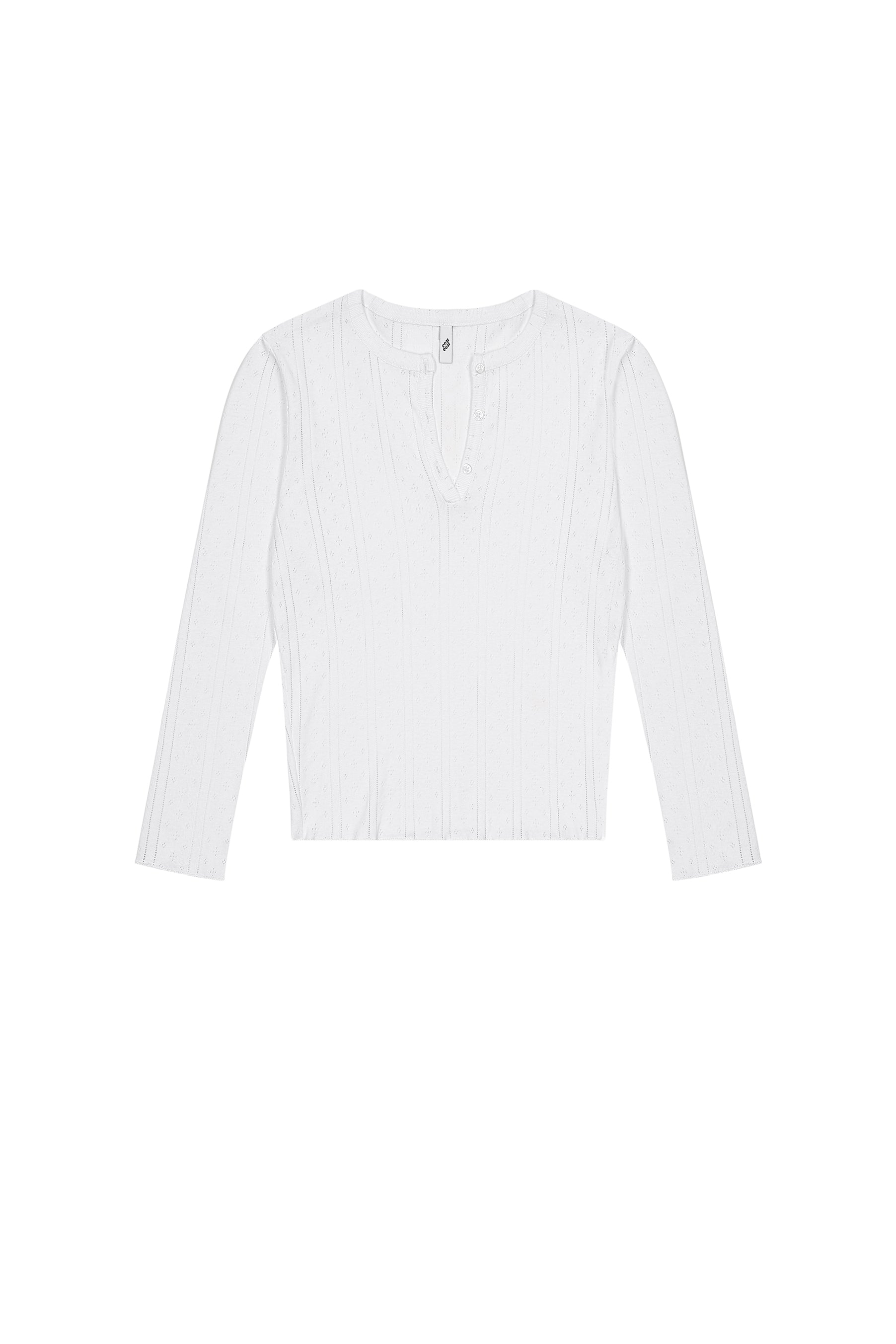 Featuring a crop fit & henley neckline with 3 petit buttons.
