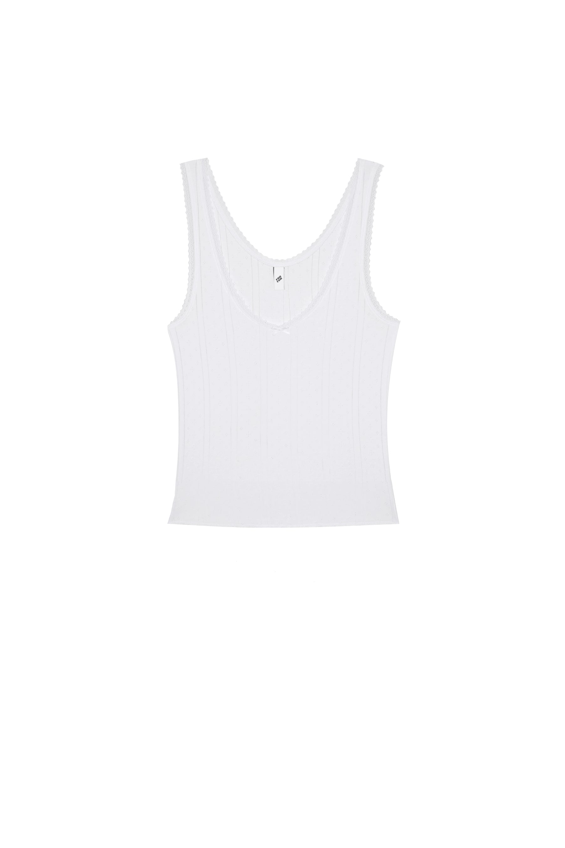 Your favourite childhood vest, reimagined. Featuring a scoop neckline & slightly cropped body, sitting just below the belly button. Trimmed with our signature French Lace & finished with a baby, centre-front bow.