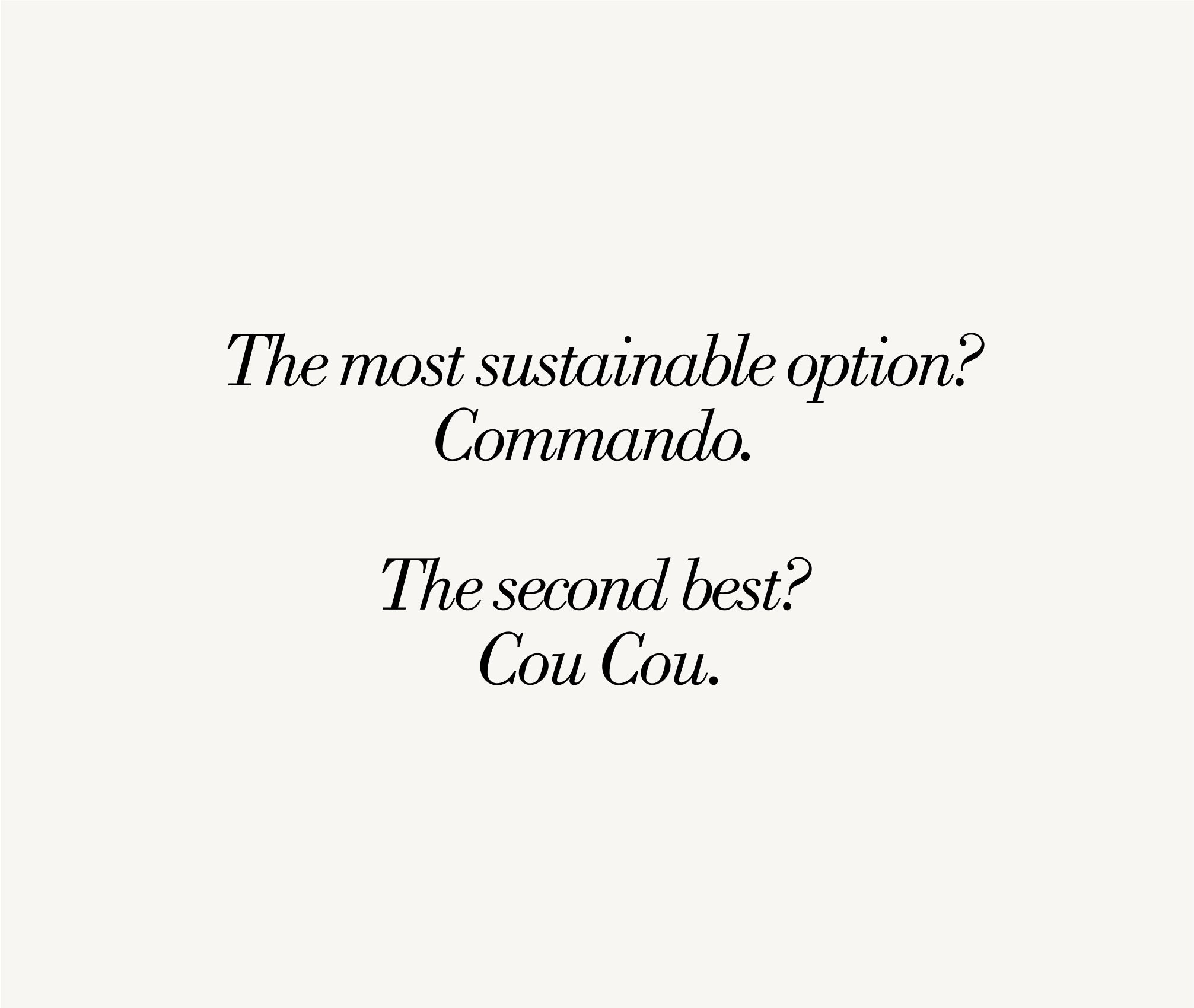 The most sustainable option? Commando. The second best? Cou Cou. We make intimate essentials for your everyday that are made to love & made to last—crafted from the highest quality, super-soft 100% Organic Cotton: a sustainably sourced fabric that’s compostable, too. And with every order, we donate 1% to our nonprofit partners working for people and planet. By designing for longevity, embracing transparency, and reimagining your most-worn garments with softness, sustainability, and intention, we hope to make your most disposed-of garments a little less disposable.
