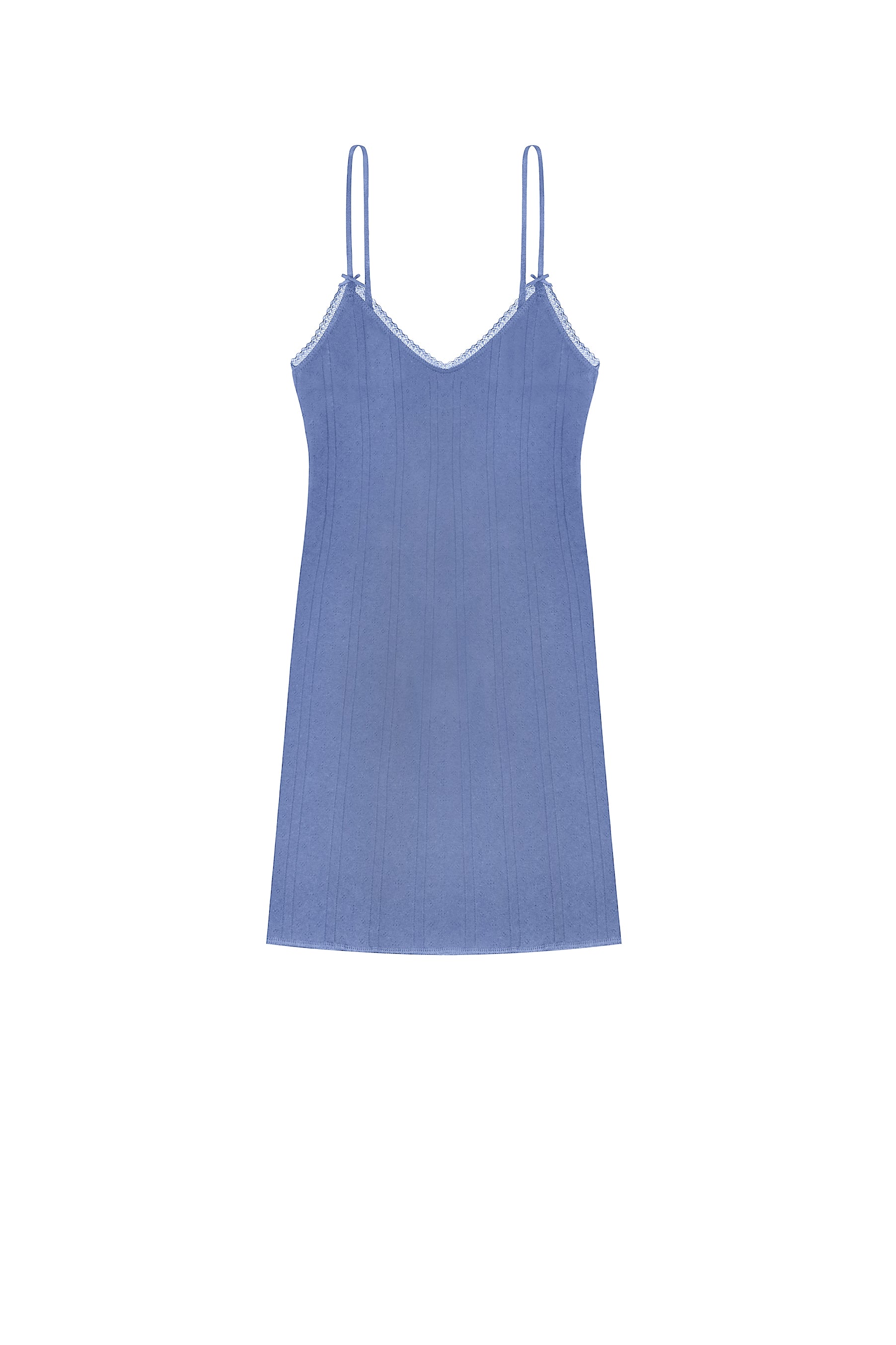 Mini length with a ever-so-subtle, flirty flare at the hem. Slight v-neck, delicate strapping and finished with 2 petit bows.