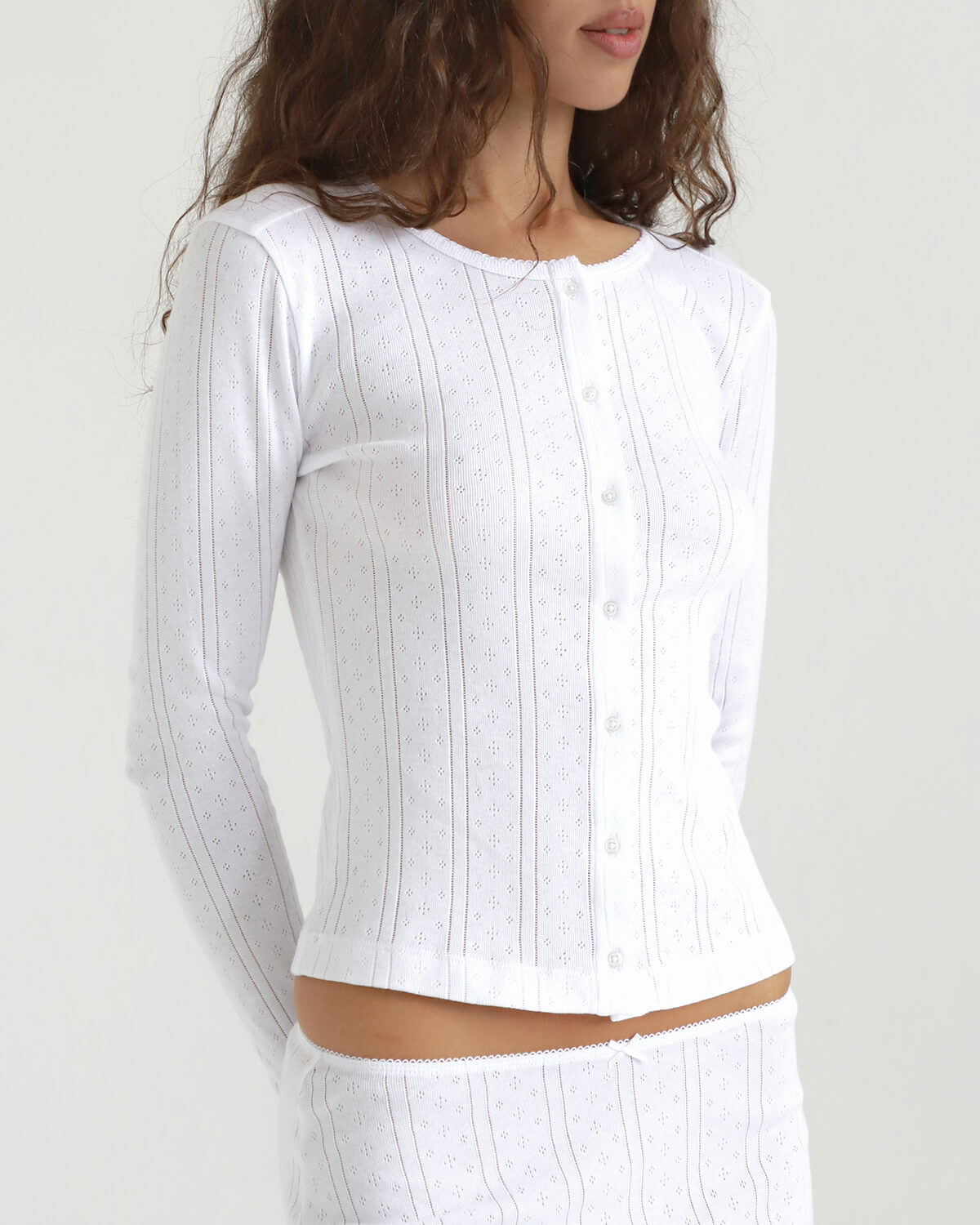 Featuring a shrunken, full length bodice and sleeves, delicate picot detailing on the neckline and petit front-button fastening. We recommend sizing up in The Cardigan.