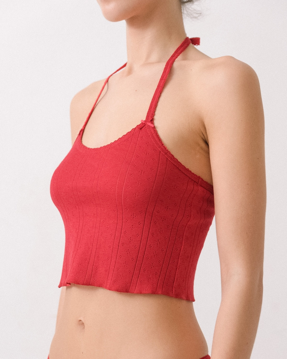 Featuring a crop fit, tie-back & delicate picot-trim detailing.