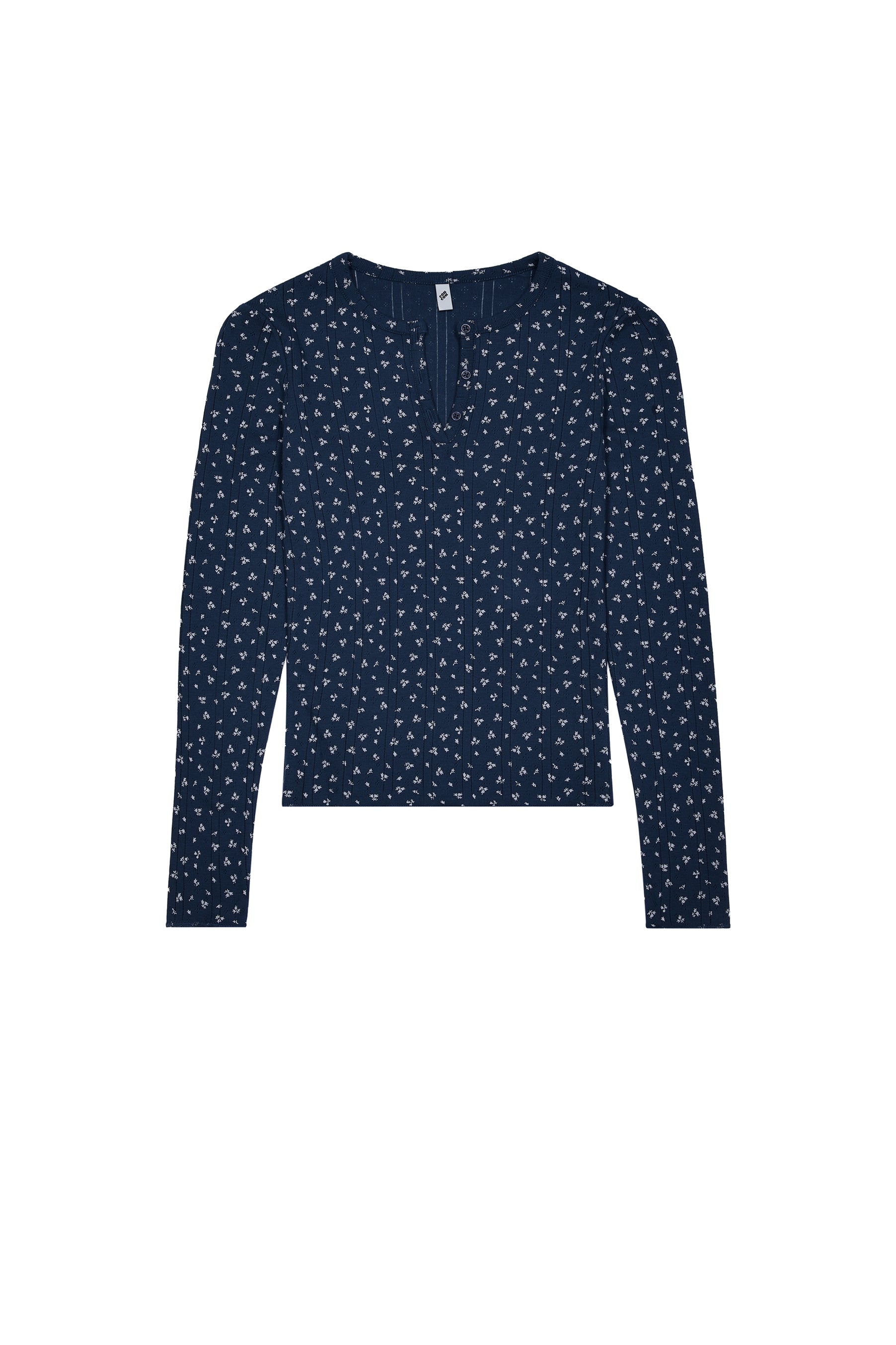 The Henley features a regular length just below the belly button, long-ish baby sleeves, finished with 3 petit buttons.